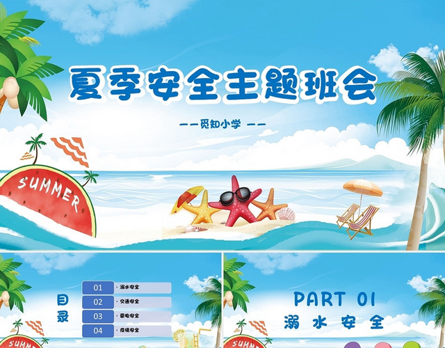 关键词:蓝色PPT 卡通PPT 主题班会 夏季安全 安全主题班会 班会PPT