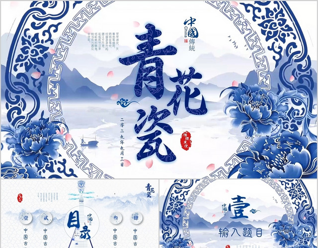 唯美中国风青花瓷视频背景蓝色古风水墨商务通用PPT中国风简约