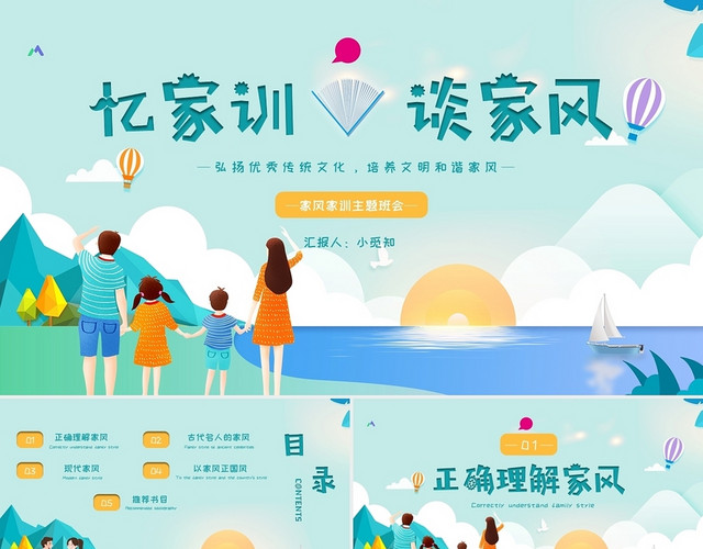 薄荷绿剪纸卡通卡通家风家训主题班会PPT模板