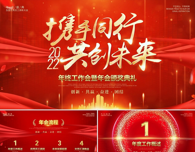 包站长提供红金携手同行共创未来视频片头公司年会工作会颁奖典礼PPT免费下载,作品有版权,可商用,文字图片等主体内容皆可修改,更多关于年会PPT下载,就来包站长。